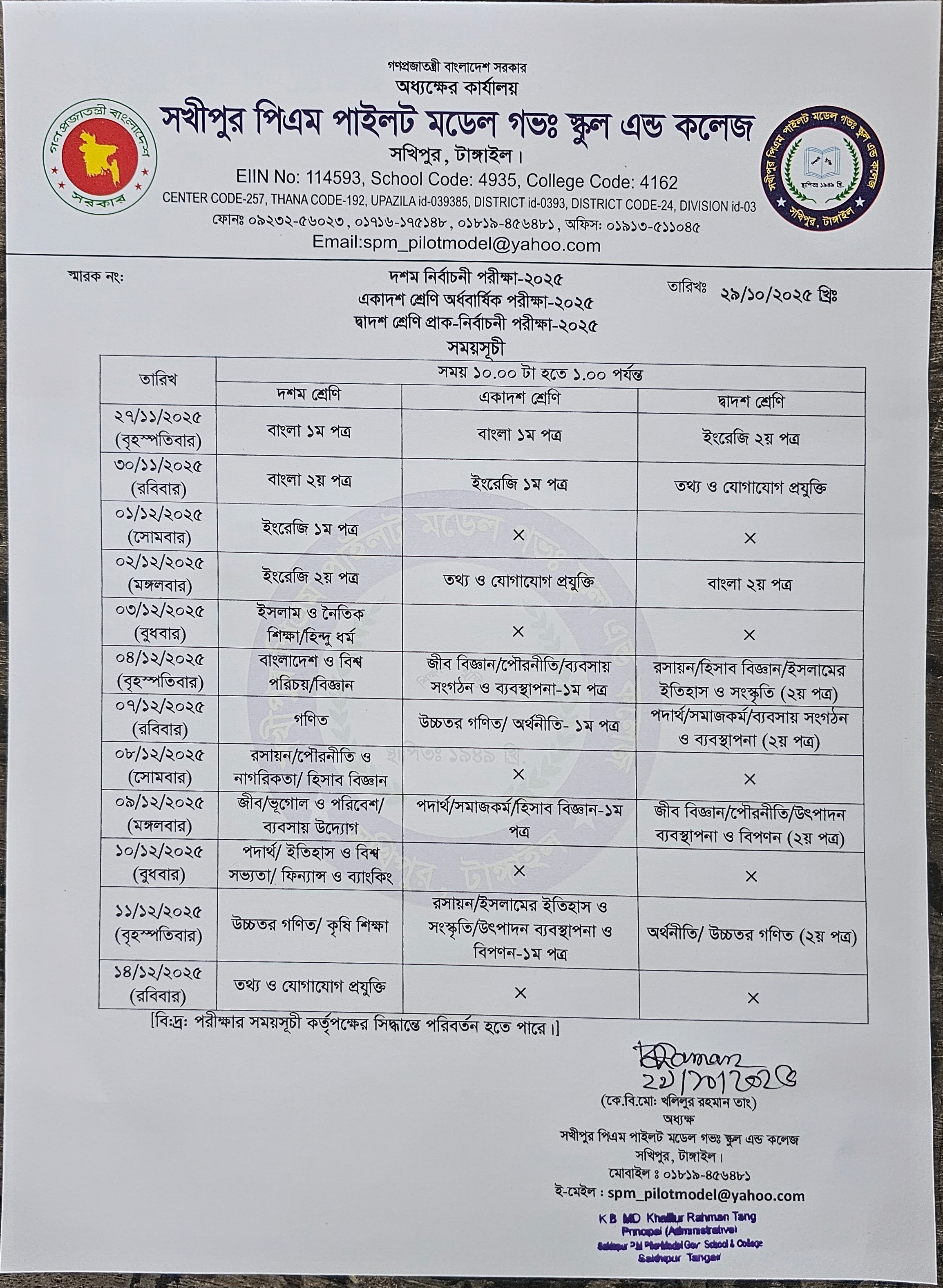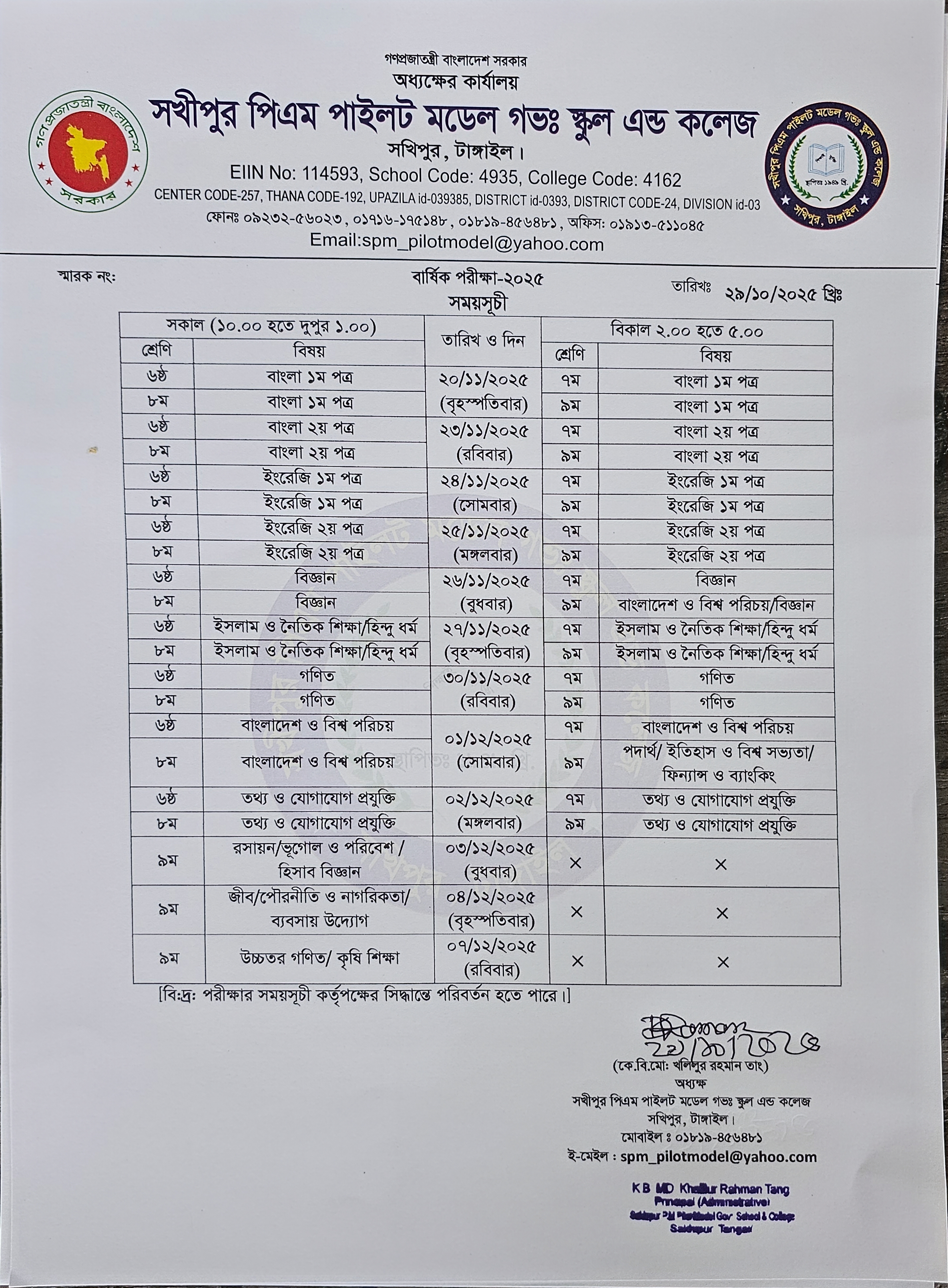 | ৩ | নির্বাচনী, অর্ধ বার্ষিক, প্রাক নির্বাচনী পরীক্ষার সময়সূচি। | ২০২৫-১০-৩১ |